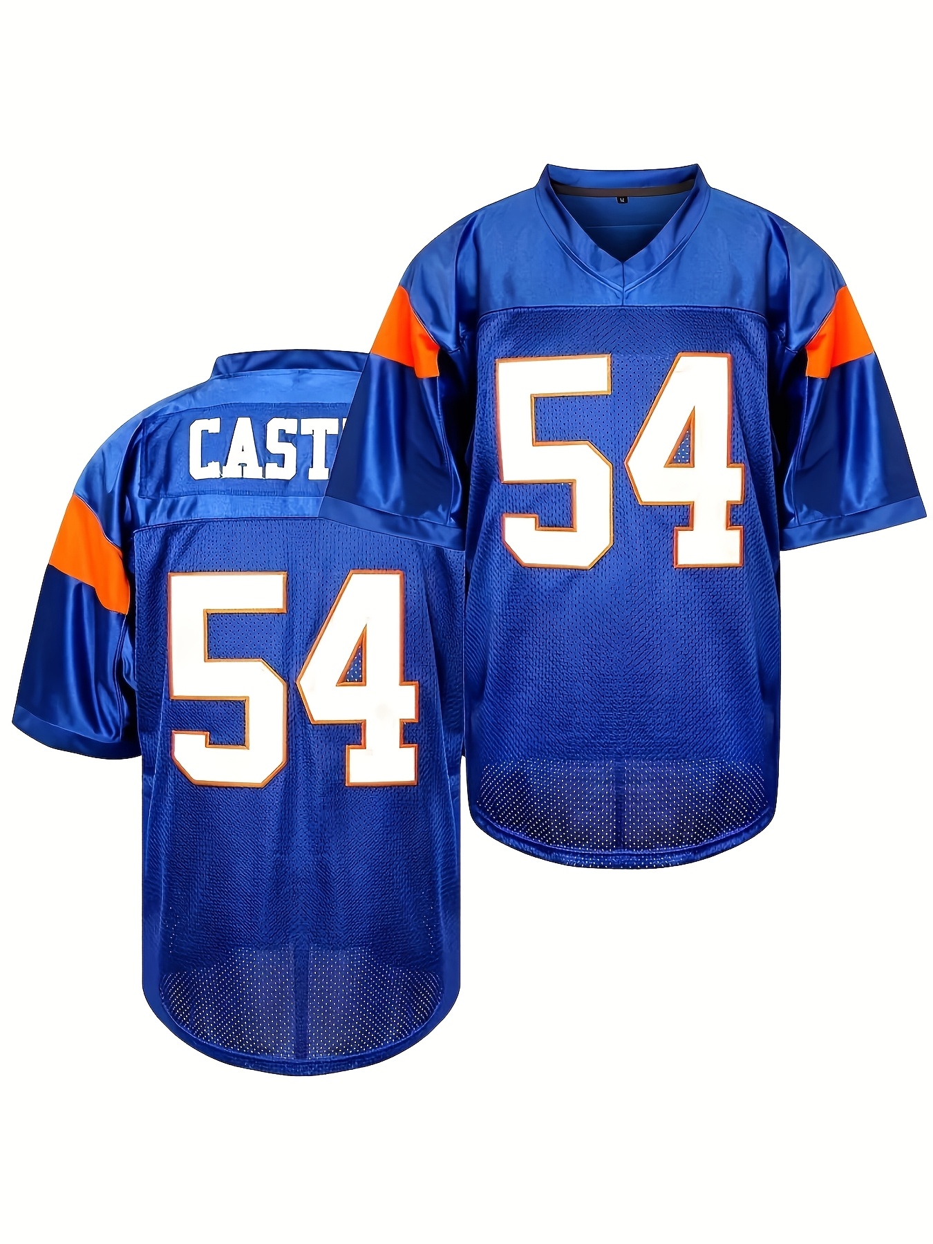1pc Men'S Polyester V-Neck American Football Jersey - Loose Fit Short Sleeve Sports Shirt with Embroidered #54 & CASTLE, Knit Fabric for Casual, Training, Hiking & Outdoor Activities, Universal Fit for Teens & Adults