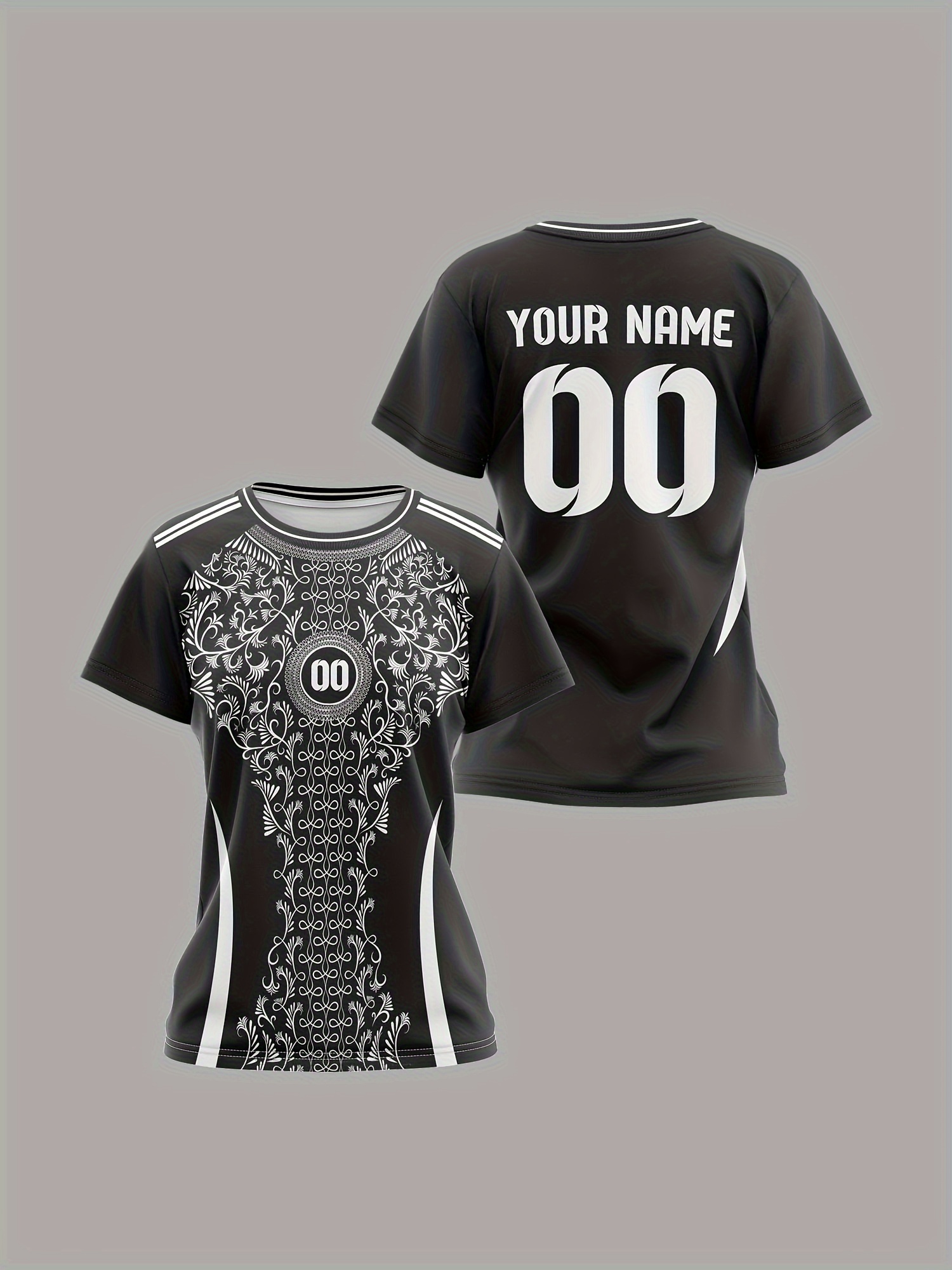 Personalized Women'S Plus Size Soccer Jersey - Custom Name & Number, Black with White Floral Design, Breathable Summer Sports T-Shirt for Casual or Team Wear, Soccer Shirts, Team Uniform, Detailed Print, Quality Print Shirt