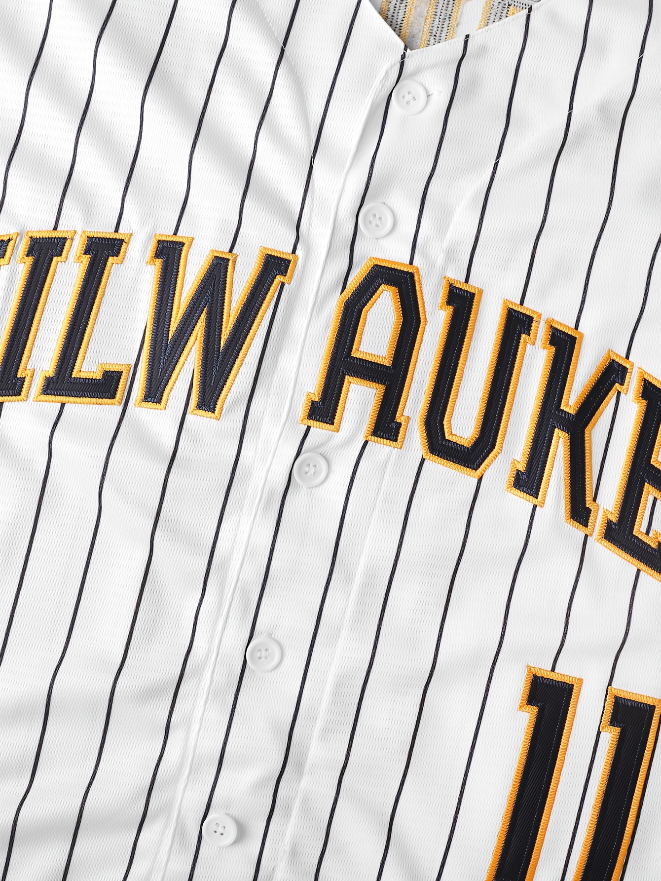 Men'S #11 White Full Embroidered Baseball Jersey, Black Polyester Sports Shirt, V-Neck