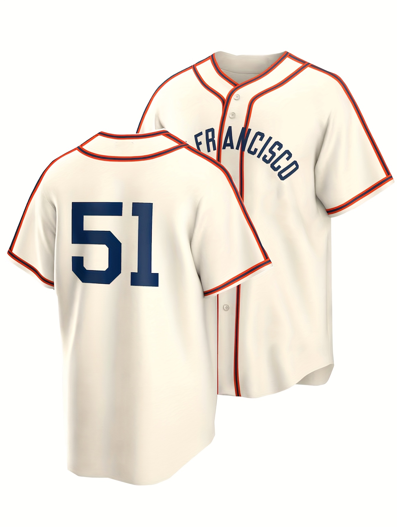 Men's Retro Classic Baseball Jersey #51 - Beige with Red & Blue Accents, Embroidered San Francisco & Number, Breathable V-Neck Button-Up Loose Fit for Training, Competition, Casual & Holiday Wear, Sports Apparel | Sporty Vneck | Embroidered Detailing