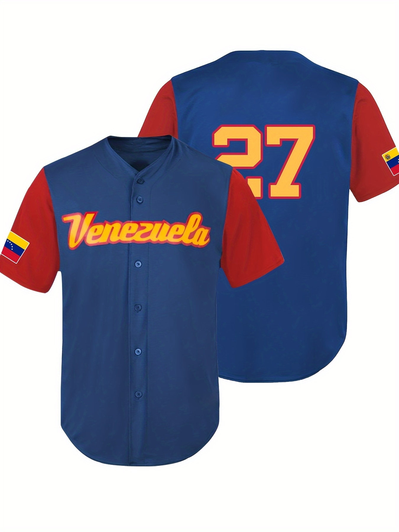 Men's Venezuela #27 Retro Baseball Jersey - Color Block V-Neck Button-Up Shirt with Flag Design, Loose Fit Breathable Fabric for Training, Competition & Casual Wear (All-Season), Event Clothing, Sporty Look, Detail