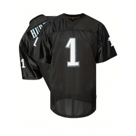 Men'S #1 Striped Baseball Jersey, 100% Polyester V-Neck Short Sleeve T-Shirt with Lettering, Breathable Knit Fabric for Sports & Casual Wear, Loose Fit Button-Up Top for All Seasons